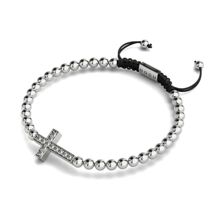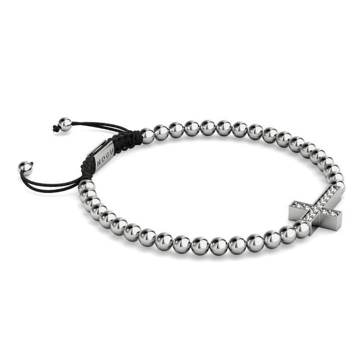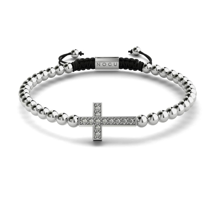 Finish: SilverBase: Stainless Steel Bead Size: 8mm Crystal: Austrian Crystals Cord: Clear Elastic The NOGU Gilded Cross Bracelets are hand-crafted from 6mm beads and are hand-strung on a clear elastic...