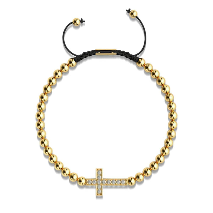 Metal Finish: 18k Gold Bead Size: 4mm Cord: Adjustable Woven Nylon Metal Base: Stainless Steel The Crystal Cross Charmballa bracelets are hand-crafted from 4mm beads and are hand-strung on an adjustable woven...