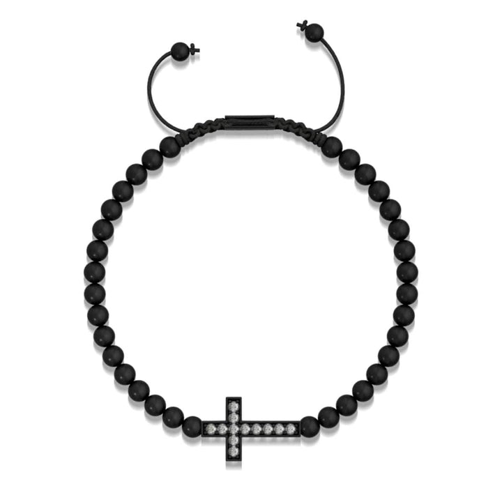 Base: Stainless Steel Finish: Gunmetal Bead Size: 8mm Crystal: Austrian Crystals Cord: Clear Elastic The NOGU Gilded Cross Bracelets are hand-crafted from 6mm beads and are hand-strung on a clear elastic...