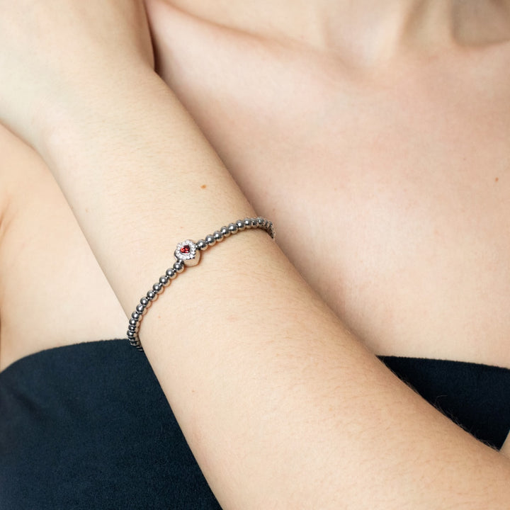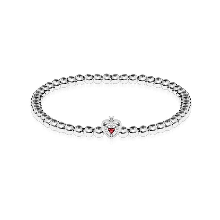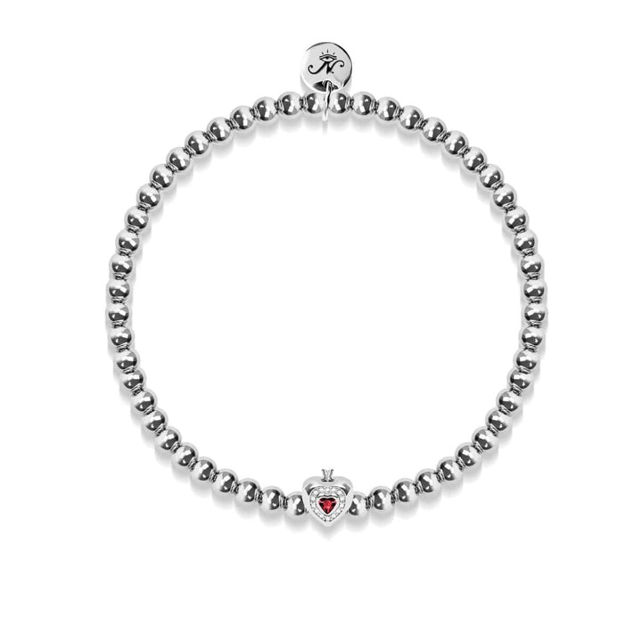 Charity 5% of net sales donated to Heart & Stroke Foundation Base: Stainless Steel & Copper Finish: Silver Birthstone: Ruby Crystal Bead Size: 4mm Cord: Clear Elastic The Crystal Heart...