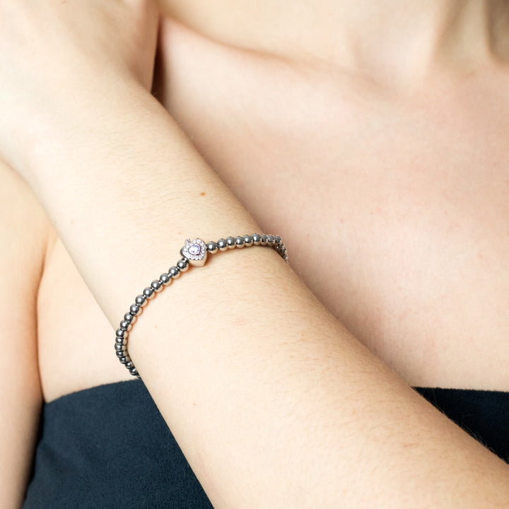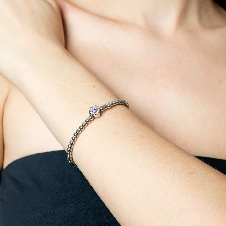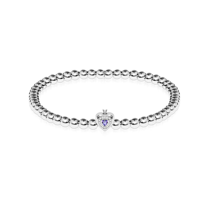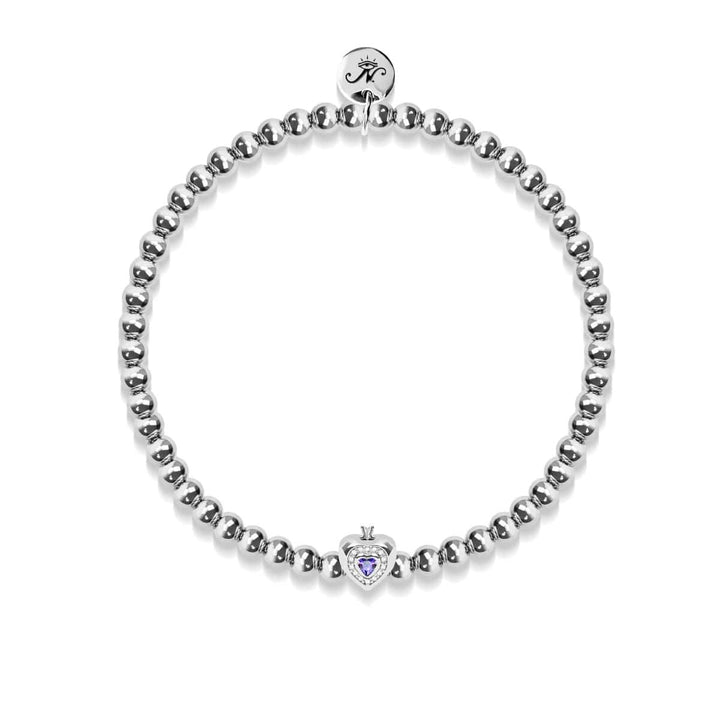Charity 5% of net sales donated to Heart & Stroke Foundation Base: Stainless Steel & Copper Finish: Silver Birthstone: Violet Crystal Bead Size: 4mm Cord: Clear Elastic The Crystal Heart...