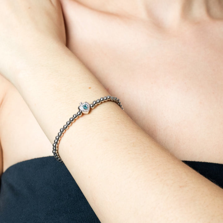 Charity 5% of net sales donated to Heart & Stroke Foundation Base: Stainless Steel & Copper Finish: Silver Birthstone: Turquoise Bead Size: 4mm Cord: Clear Elastic The Crystal Heart bracelets...