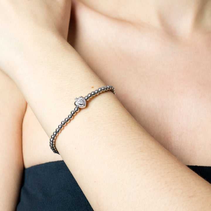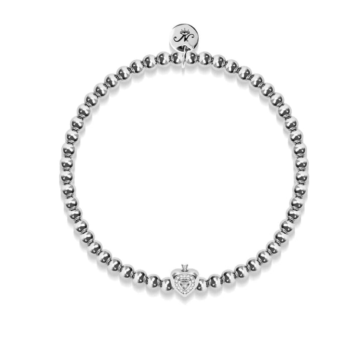 Charity 5% of net sales donated to Heart & Stroke Foundation Base: Stainless Steel & Copper Finish: Silver Birthstone: White Crystal Bead Size: 4mm Cord: Clear Elastic The Crystal Heart...
