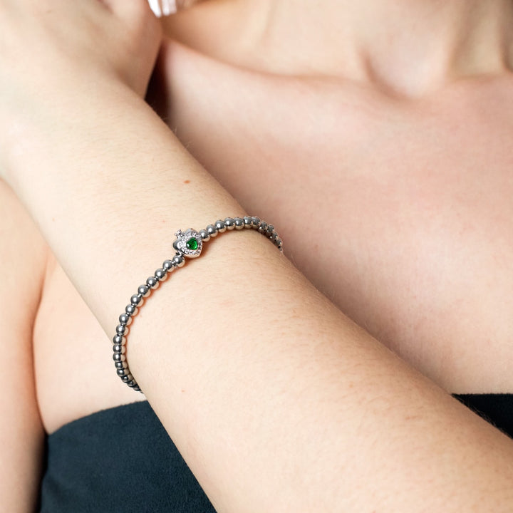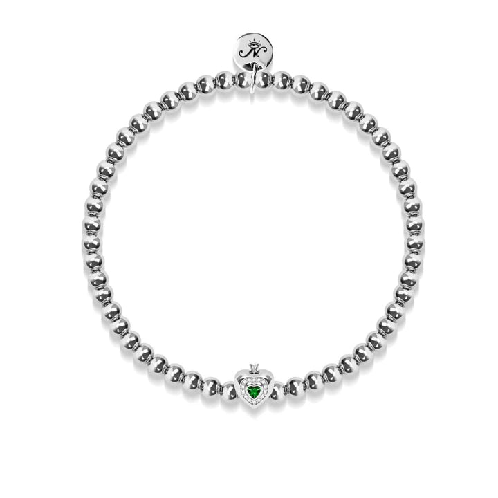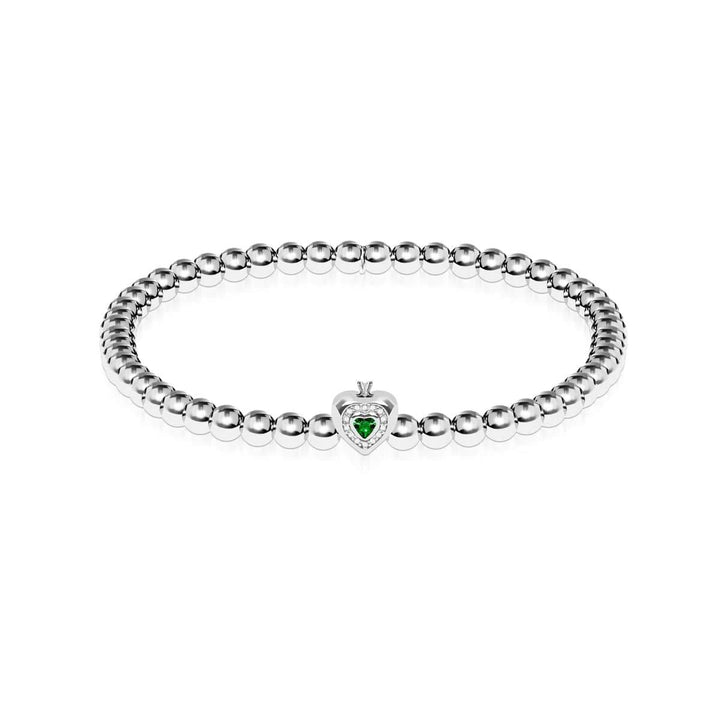 Charity 5% of net sales donated to Heart & Stroke Foundation Base: Stainless Steel & Copper Finish: Silver Birthstone: Emerald Bead Size: 4mm Cord: Clear Elastic The Crystal Heart bracelets...
