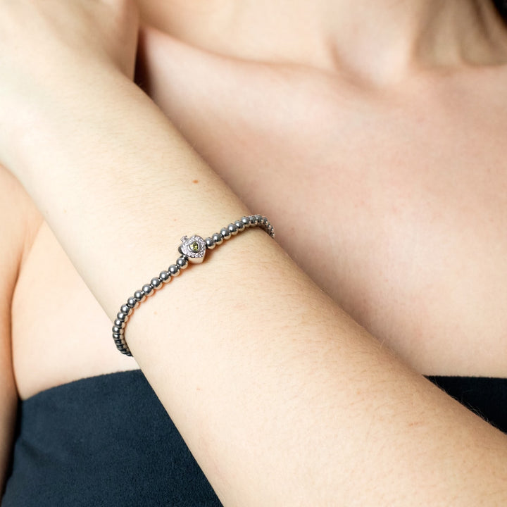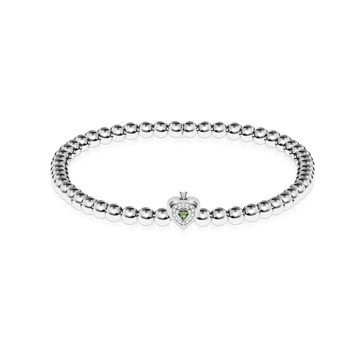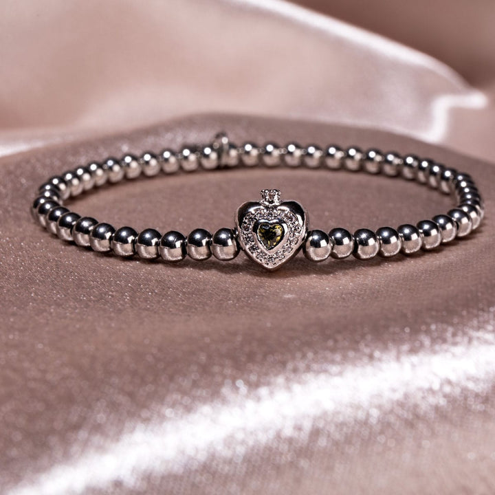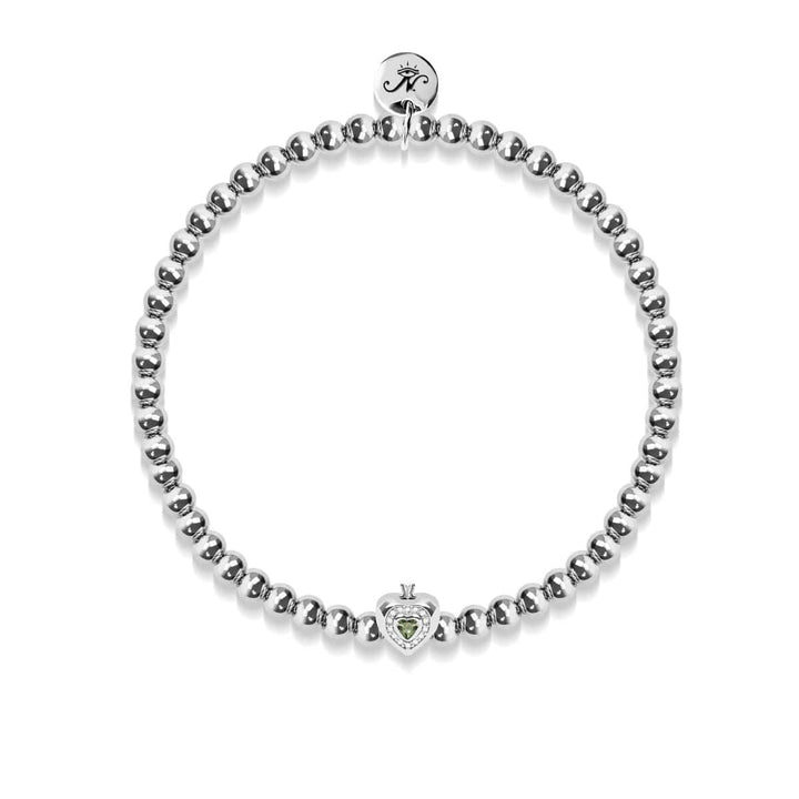 Charity 5% of net sales donated to Heart & Stroke Foundation Base: Stainless Steel & Copper Finish: Silver Birthstone: Peridot Crystal Bead Size: 4mm Cord: Clear Elastic The Crystal Heart...