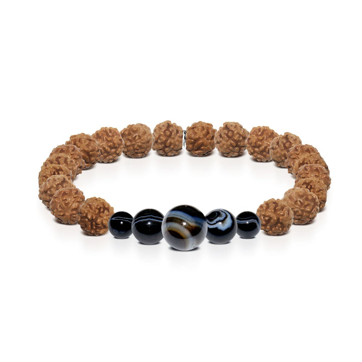 FREE Suede Polishing Gift Pouch Bead: Organic Rudraksha Prayer Seeds (8mm) Stone: Black Line Agate Metal: Silver Finish Base: Laurelian Stainless Steel Cord: Clear Stretch Size: One Size Fits Most The...
