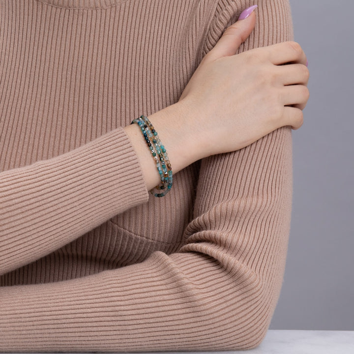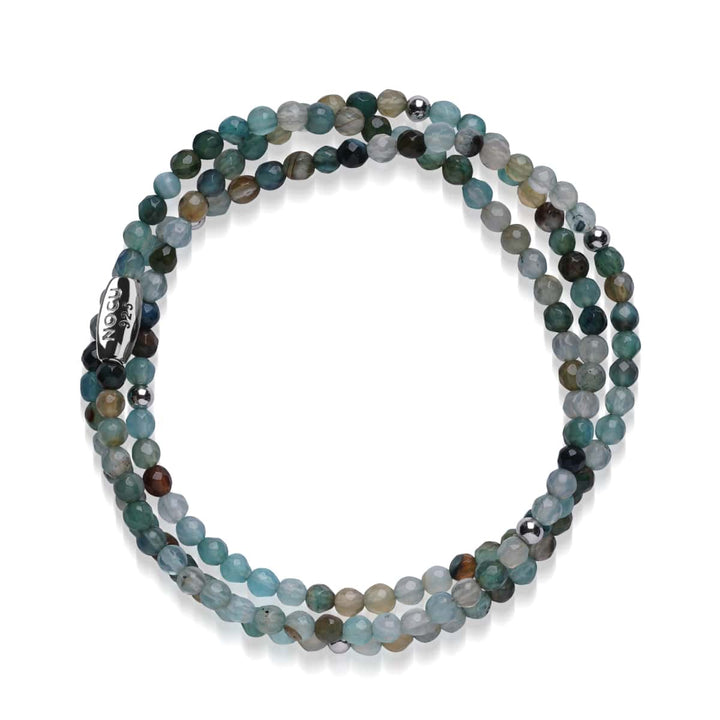 FREE Suede Polishing Gift Pouch Stone: New Green Agate Metal: Polished Stainless Steel Cord: Clear Elastic Size: 7 1/3"/ 18.5cm, Circumference , Unstretched The Calming Silver Essence Bracelet is crafted from New Green Agate. The...