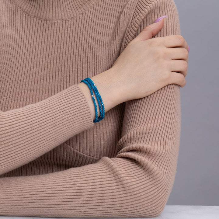 FREE Gift Box Crystal: Turquoise & Deep Blue Synth. Crystals Metal: Silver FinishBase: Stainless Steel Cord: Natural LeatherSize: Adjustable, Triple Wrap / 51-59 cm | 21 1/4" - 23 1/4" Reaching...