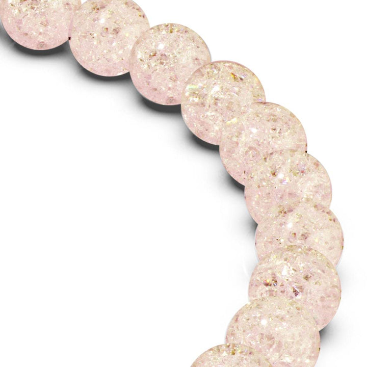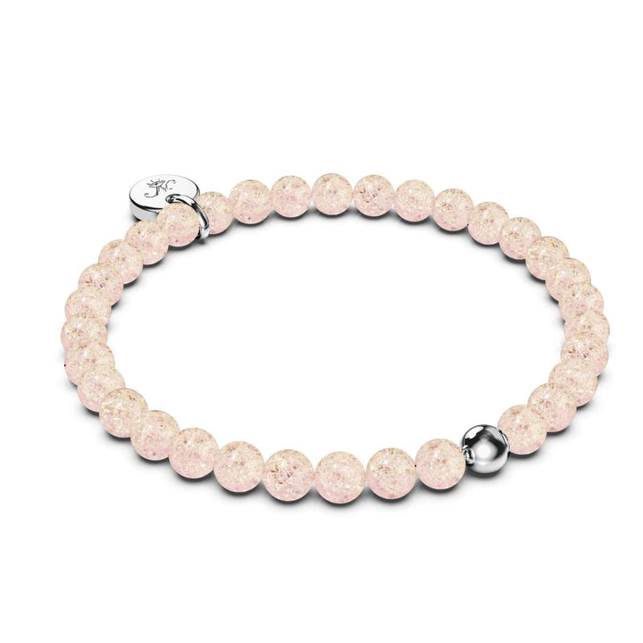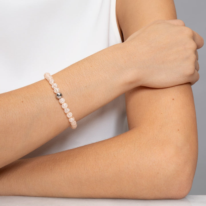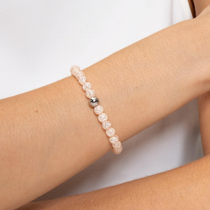 Vermeil: 18k White Gold Beads: Peach Glitter Glass™ Bead Size: 6mm Cord: Clear Elastic Base: .925 Sterling Silver The Champagne Glitter Glass bead bracelets are hand-crafted from peach 6mm glitter glass...
