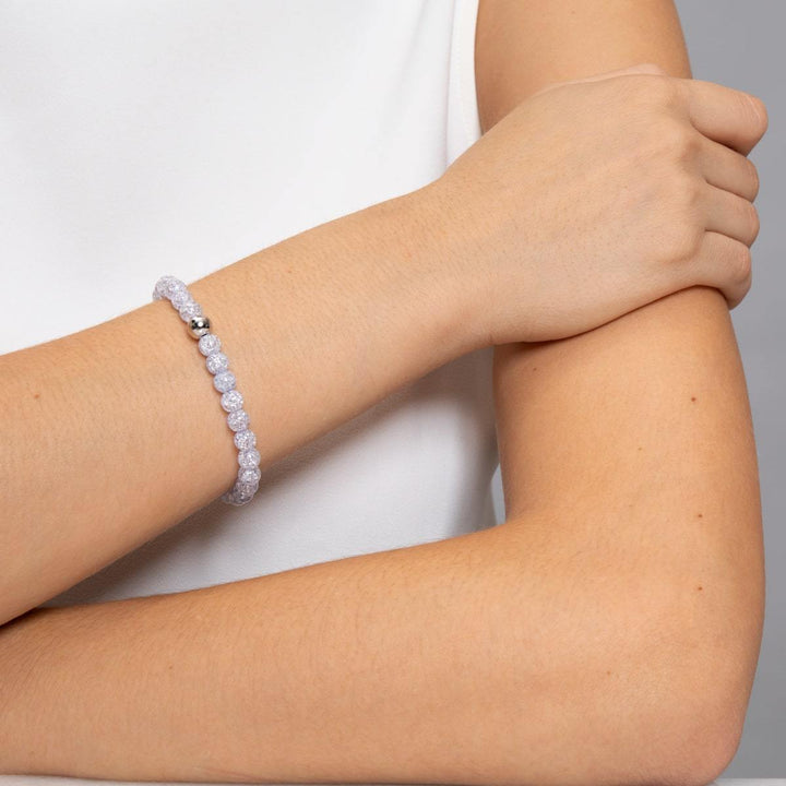 Finish: Silver Beads: White Lava Rock Bead Size: 8mm Base: Stainless Steel Cord: Clear Elastic The Fuji bracelet is hand-crafted from rugged 8mm White Lava Rock beads, is hand-strung on...