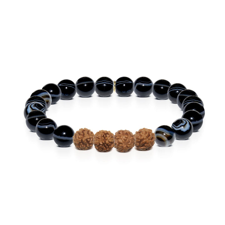 FREE Suede Polishing Gift Pouch Bead: Organic Rudraksha Prayer Seeds (8mm) Stone: Black Line Agate Metal: Gold Finish Base: Laurelian Stainless Steel Cord: Clear Stretch Size: One Size Fits Most The...