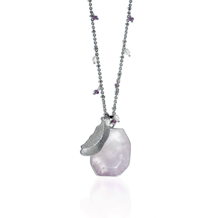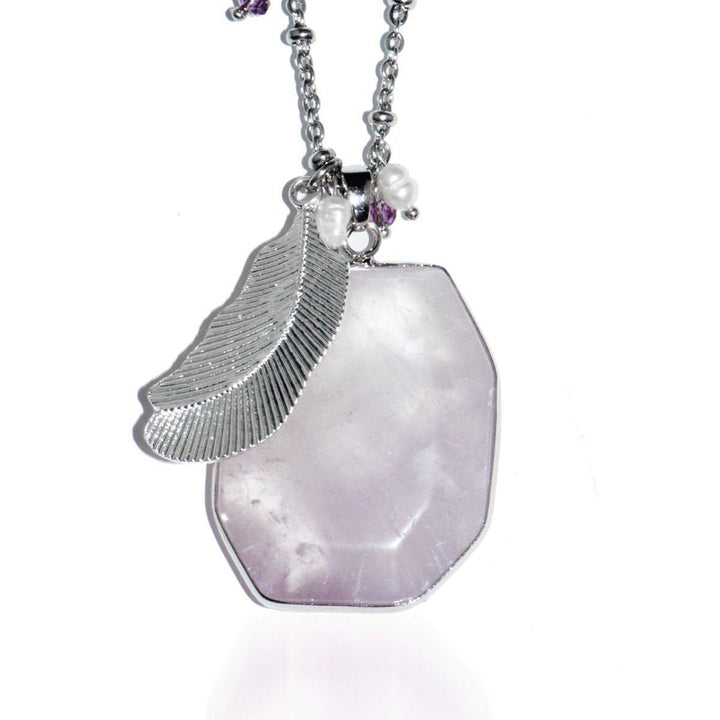 Stone: Light Amethyst, crystals and freshwater pearls Metal: Silver Finish Chain: Stainless Steel Base: Copper Clasp: Lobster Clasp Size: length of chain: 30"-331/2" | 76cm-85cm size of stone: approx. 1...