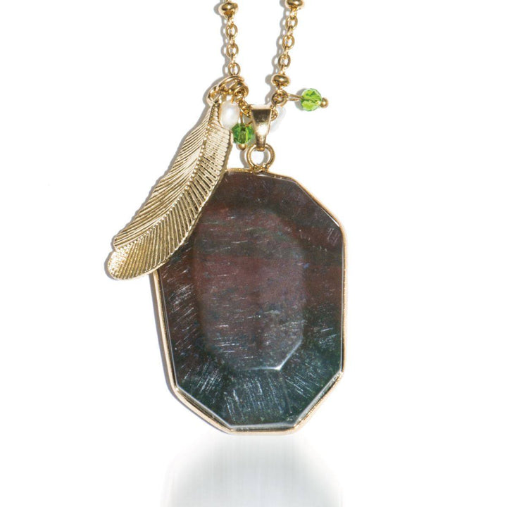 Born from ancient Greek mythology, the fabled phoenix rises from the ashes of its predecessor. The beautiful and evanescent phoenix bird is continually and cyclically reborn, symbolizing life, renewal and reincarnation. Joseph Nogucci's Phoenix Collection of statement necklaces takes inspiration from this mythical creature and features striking semi-precious stones, a feather charm, and is strung on a long stainless steel chain, resting just below the chest.