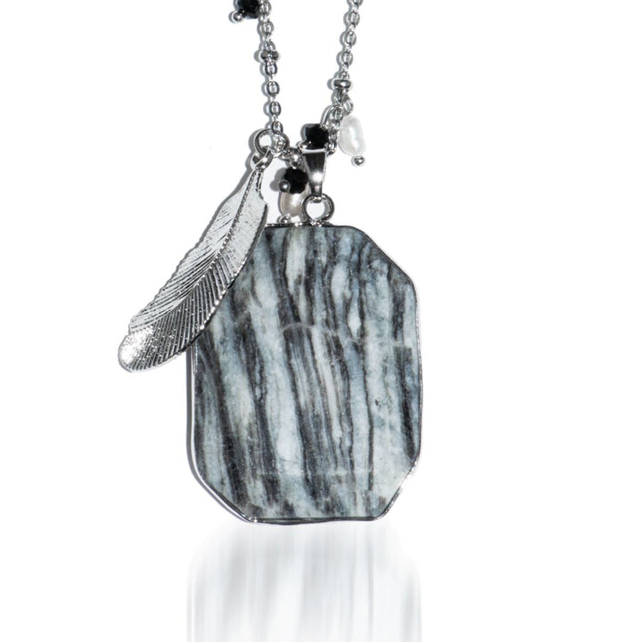 Stone: Black/White Zebra Jade, crystals and freshwater pearls Metal: Silver Finish Chain: Stainless Steel Base: Copper Clasp: Lobster Clasp Size: length of chain: 30"-331/2" | 76cm-85cm size of stone: approx....