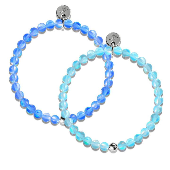 Set Includes: 2 Original Mermaid Glass ™ Bracelets Vermeil: 18k White Gold Beads: Authentic Mermaid Glass™ Bead Size: 6mm Cord: Clear Elastic Base: .925 Sterling Silver The Mermaid Glass™ bead bracelets...