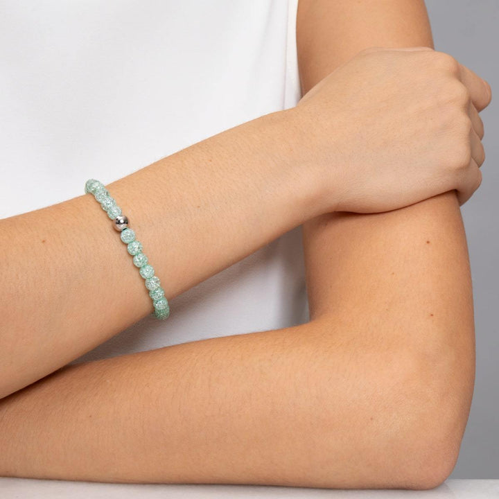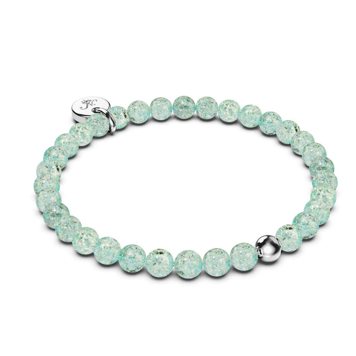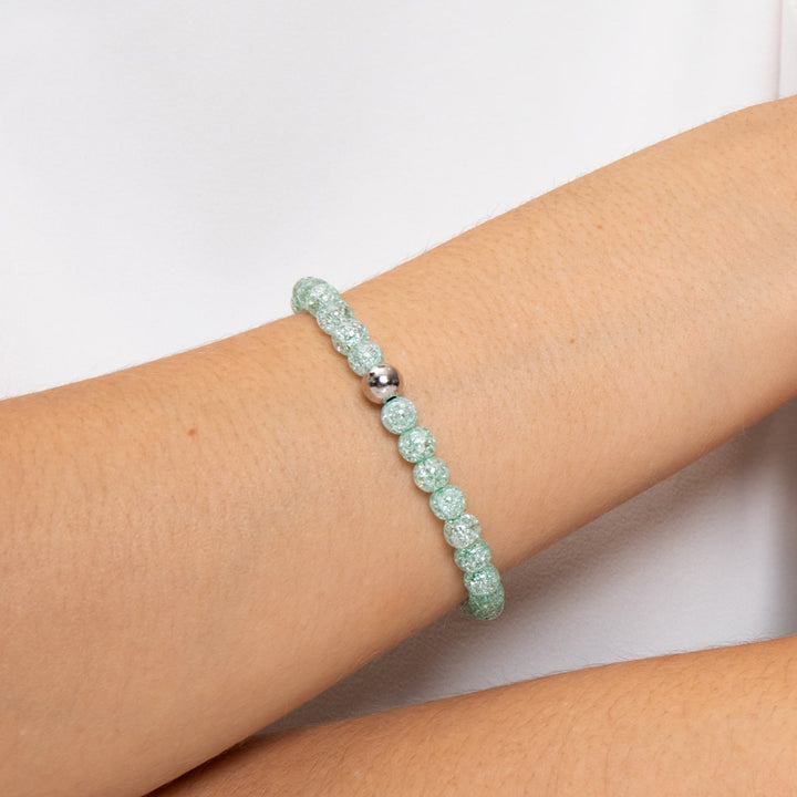 Vermeil: 18k White Gold Beads: Green Glitter Glass™ Bead Size: 6mm Cord: Clear Elastic Base: .925 Sterling Silver The Mint Glitter Glass bead bracelets are hand-crafted from green 6mm glitter glass...