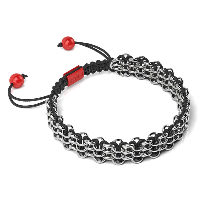 Finish: Silver Base: Stainless Steel Balance Stone: Black Line Agate Bead Size: 6mm Cord: Woven Nylon ENERGY + BALANCE The Balance Stone bead bracelets are hand-crafted from 6mm semiprecious stone beads...