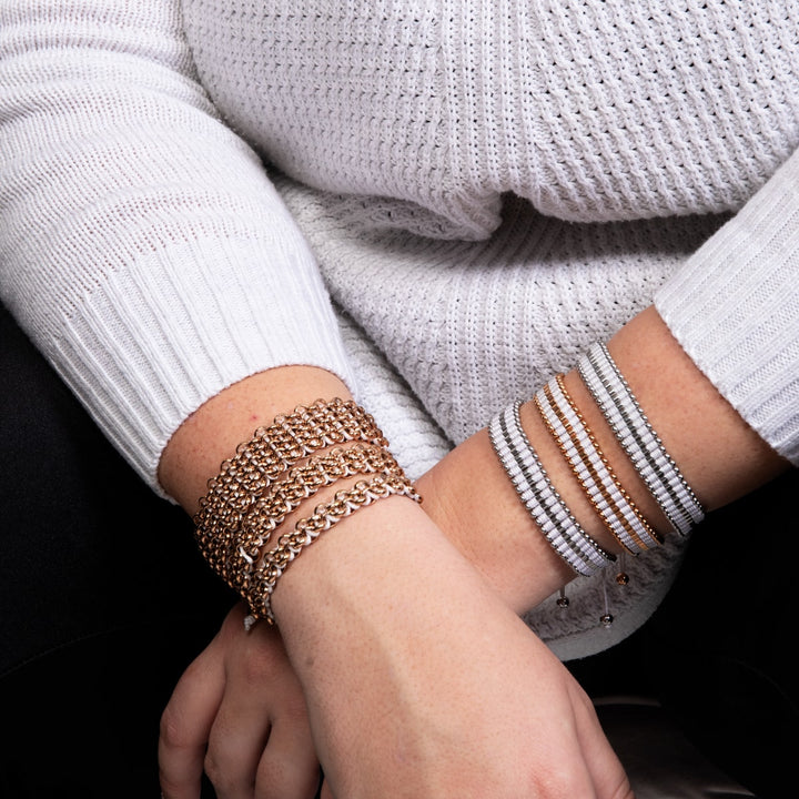 Finish: Silver Cord: Adjustable Nylon Base: Stainless Steel The Amici Macrame Bracelets are hand-crafted from bars gilded in silver, gold, rose gold, or black gunmetal and are hand-strung on an...