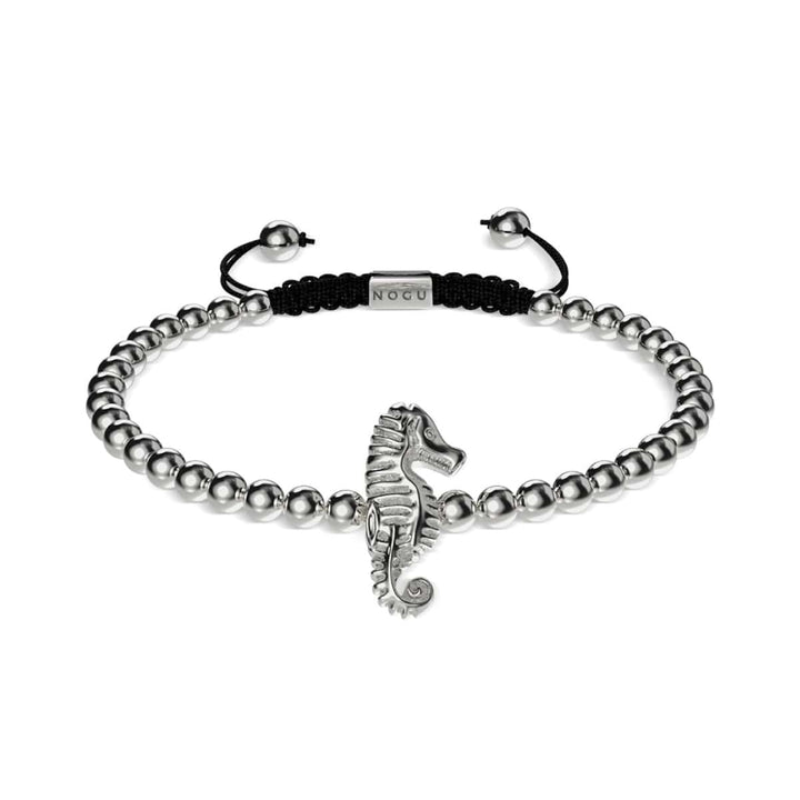 Finish: Silver Base: Stainless Steel Bead Size: 4mm Cord: Black Adjustable Nylon The Reef Seahorse Charm Bracelets are hand-crafted from 4mm beads and are hand-strung on an adjustable nylon cord....