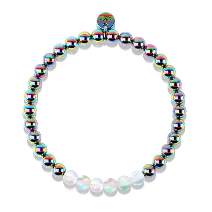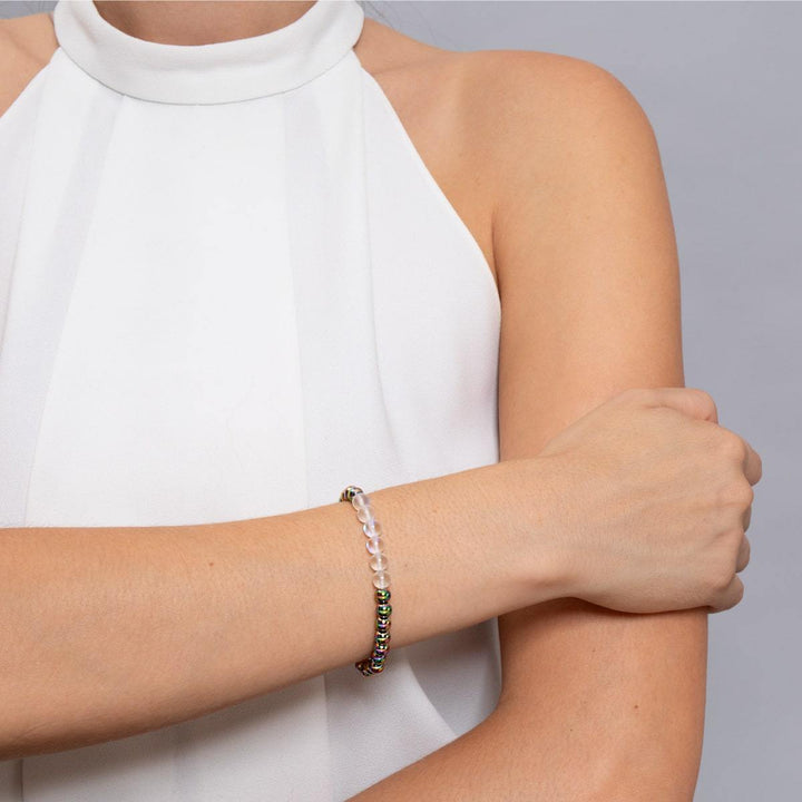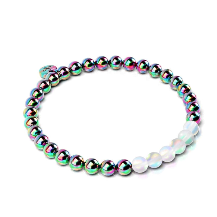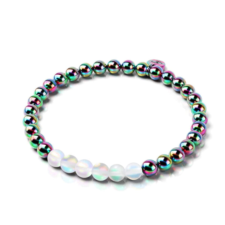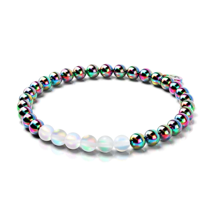 Finish: Unicorn Silver™ Beads: Authentic Mermaid Glass™ Bead Size: 6mm Cord: Clear Elastic Base: Stainless Steel The Mermaid Glass™ Expression bead bracelets are hand-crafted from 6mm beads and are hand-strung...