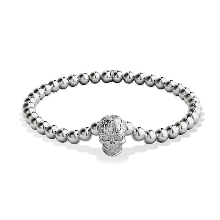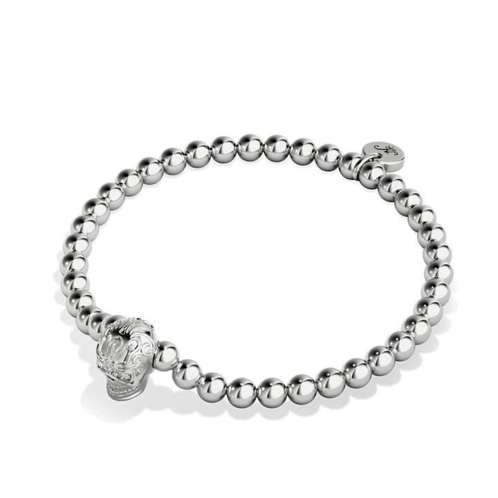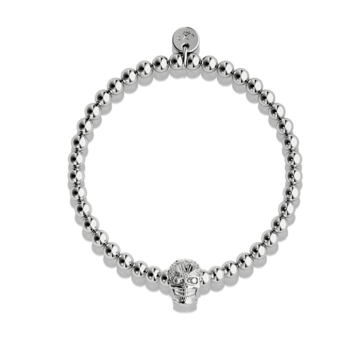 Base: Stainless Steel & Copper Finish: Unicorn Silver ™ Crystals: Austrian Crystals Bead Size: 5mm Cord: Clear Elastic The Crystal Skull bracelets are hand-crafted from 5mm beads and are hand-strung on...