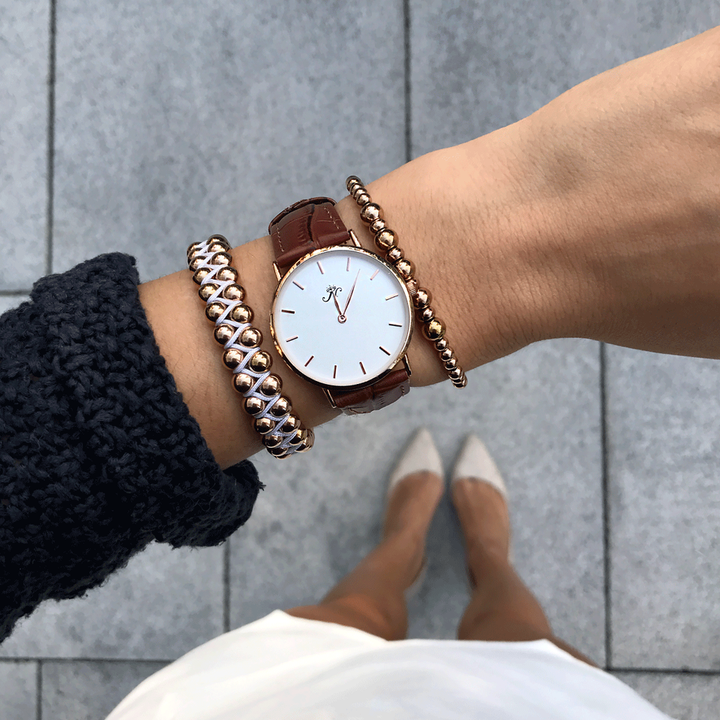Base: Stainless Steel Finish: 18k Rose Gold Beads: Stainless Steel Bead Size: 6mm / 8mm Cord: Clear Elastic The Expression bracelets are hand-crafted from 6mm beads and are hand-strung on...
