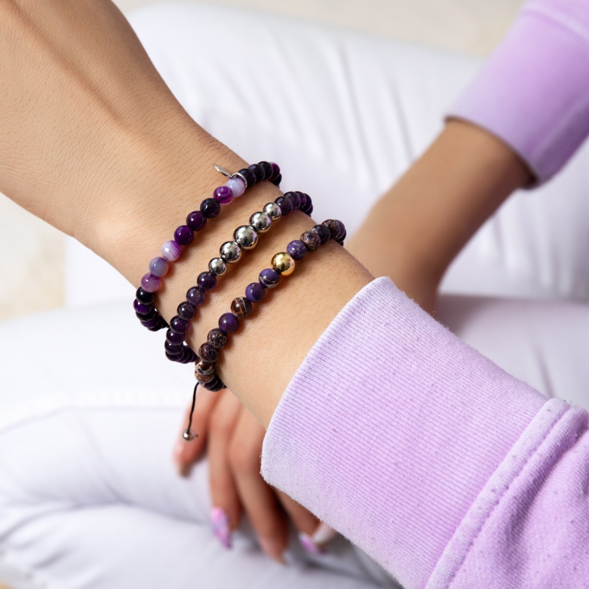 The Balance Gemstone bead bracelets are hand-crafted from 6mm semiprecious gemstone beads and are hand-strung on an adjustable macrame hand-woven cord. The Balance Gemstone bracelets are available in an expansive range of stunningly colored gemstone beads and a stainless steel centerpiece with 18k gold or silver finish. Each bracelet includes a matching stainless steel logo bar. With their adjustable cord, the bracelets are one-size-fits-all.