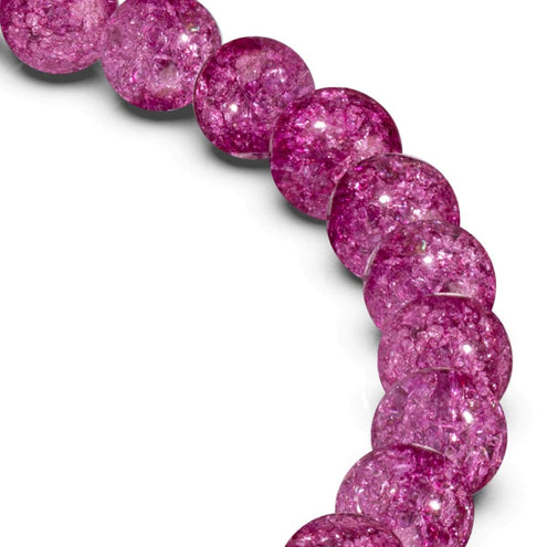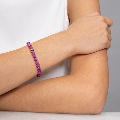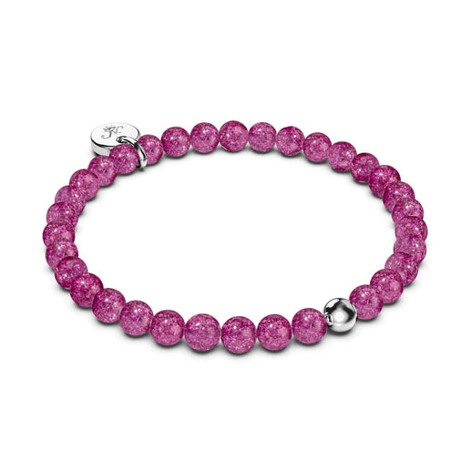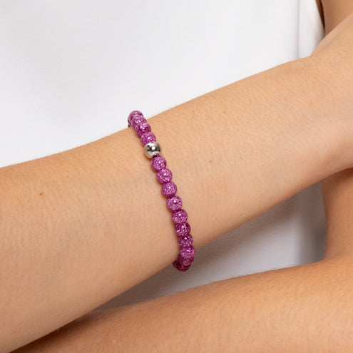 The Cranberry Glitter Glass bead bracelets are hand-crafted from magenta 6mm glitter glass beads and are hand-strung on a clear elastic cord. The glitter glass bracelets are available in a selection of spellbindingly colorful and intricately patterned glitter glass beads and a solid .925 sterling silver centerpiece. Each bracelet includes a matching .925 sterling silver logo charm with white gold vermeil. With their stretchable clear elastic cord, the bracelets are one-size-fits-most.