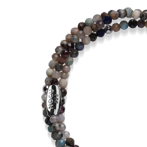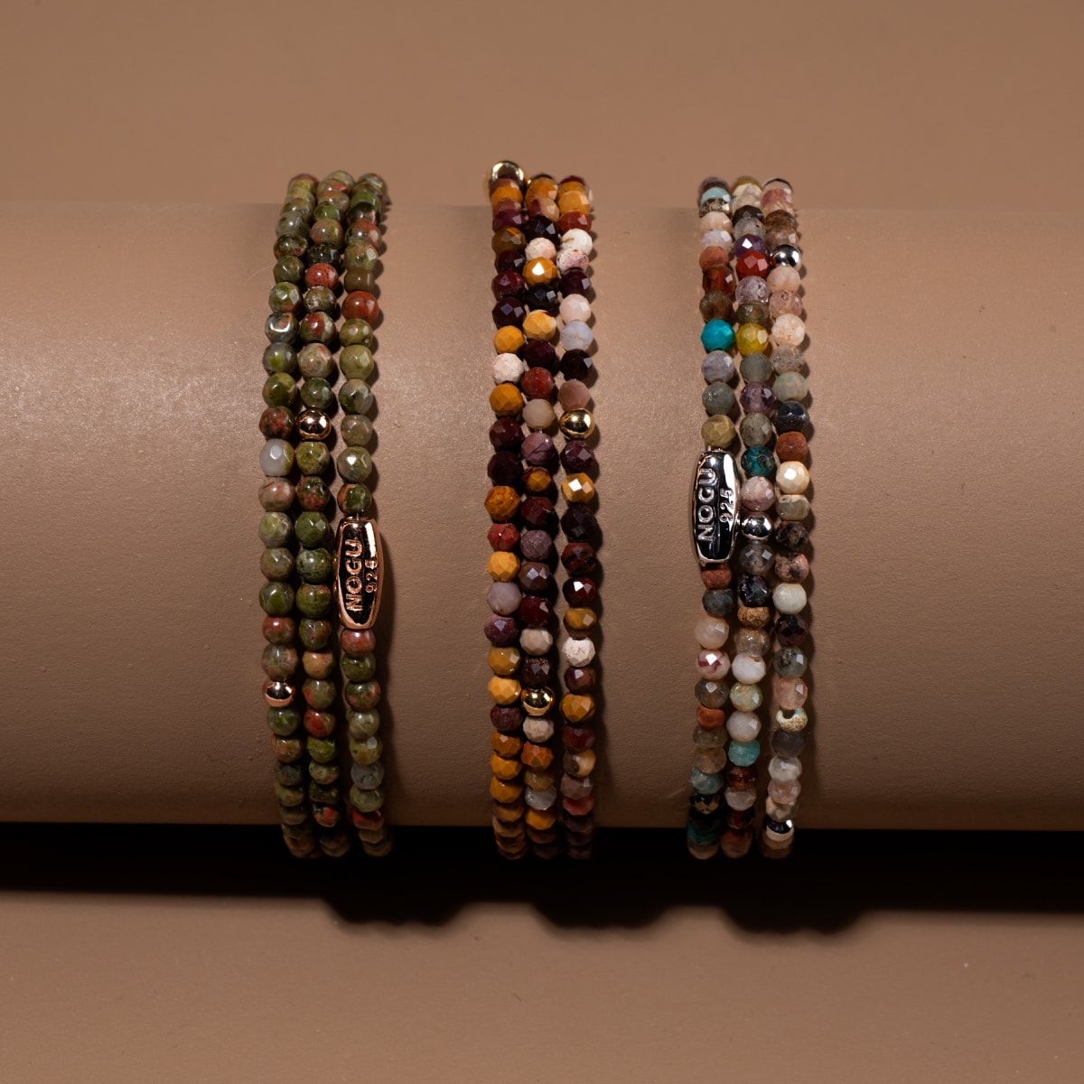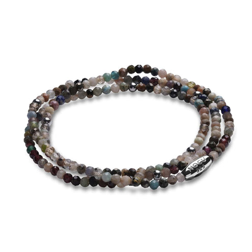 The Gemstone Wraps are hand-crafted from finely detailed gemstone beads between 3mm and 3.5mm in size, and are hand-strung onto their long and versatile 21 inch strand capable of being worn as either a wrap bracelet or as a necklace. The Gemstone Wraps are available in a wide range of brilliantly patterned natural gemstone and crystal beads charged with meaning and energy and a .925 sterling silver accent beads with 18k white, 18k yellow gold or 18k rose gold vermeil. Each wrap includes a matching .925 sterling silver engraved NOGU charm.
